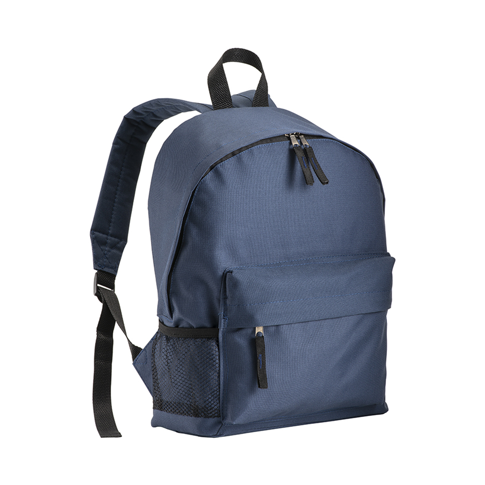 600D polyester 3-pocket backpack (one mesh side pocket). Adjustable shoulder straps