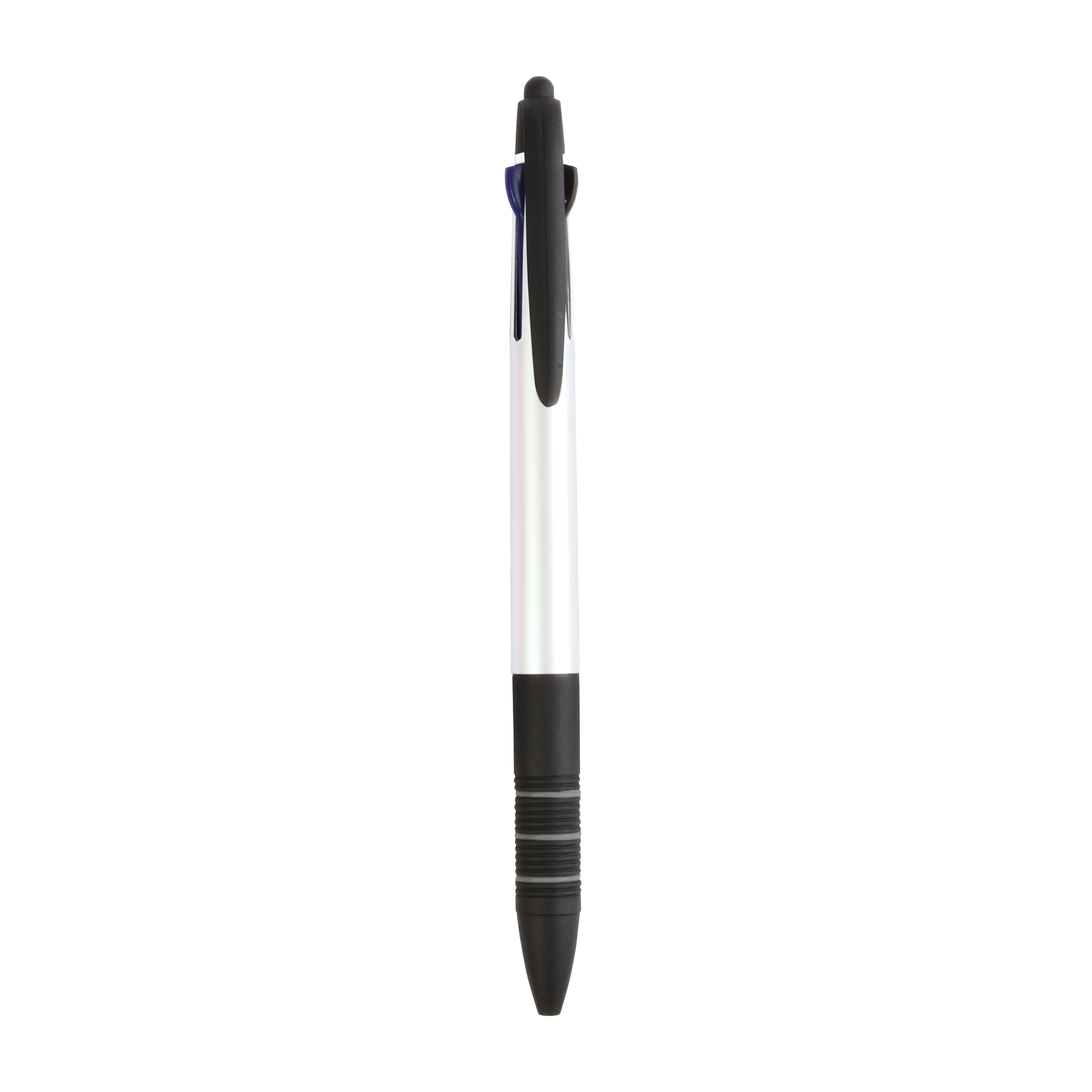 Penna a scatto in plastica con 3 refill dei colori blu, nero e rosso, con gommino per touch screen