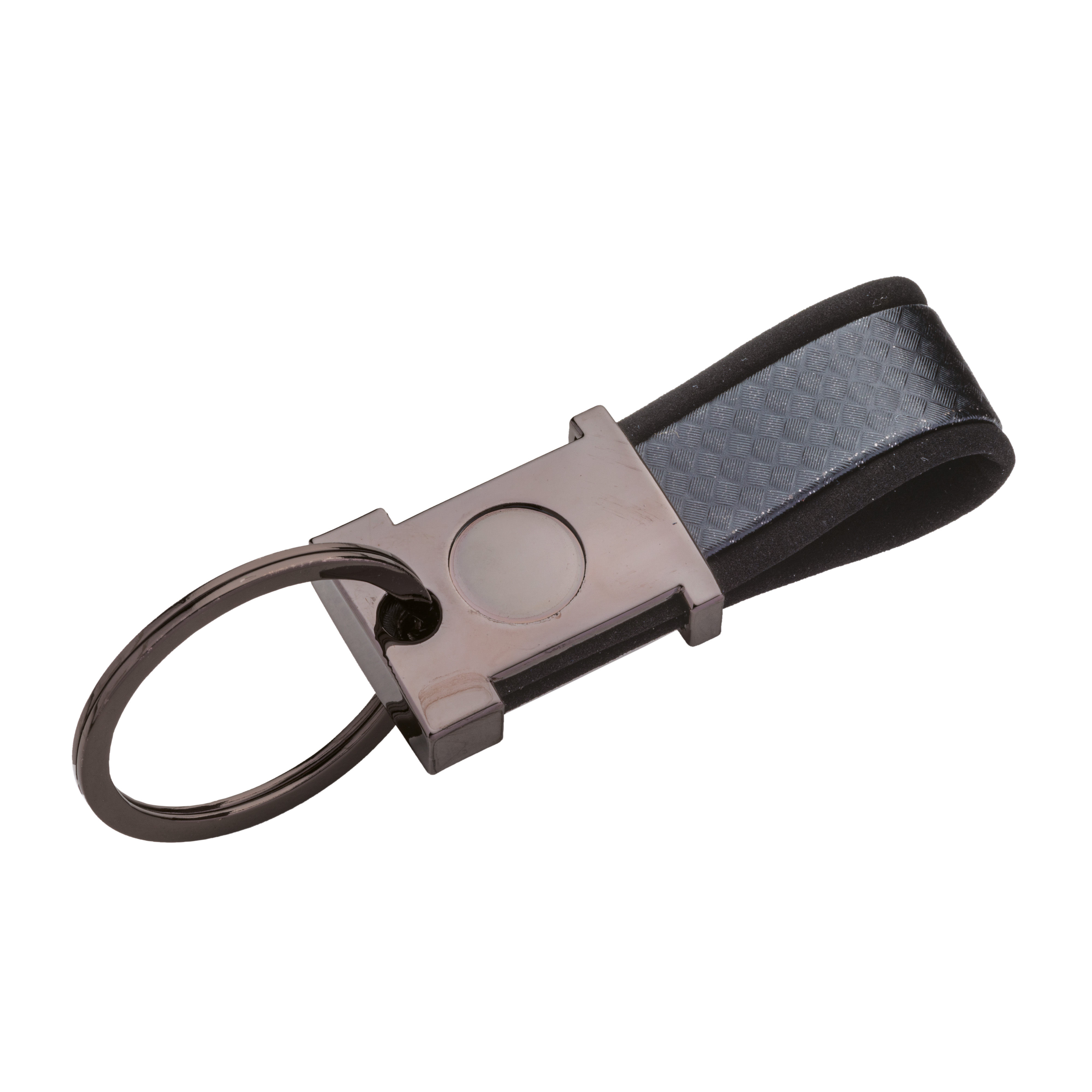 Portachiavi in metallo brunito e PU bicolore, con spazio idoneo al logo resina